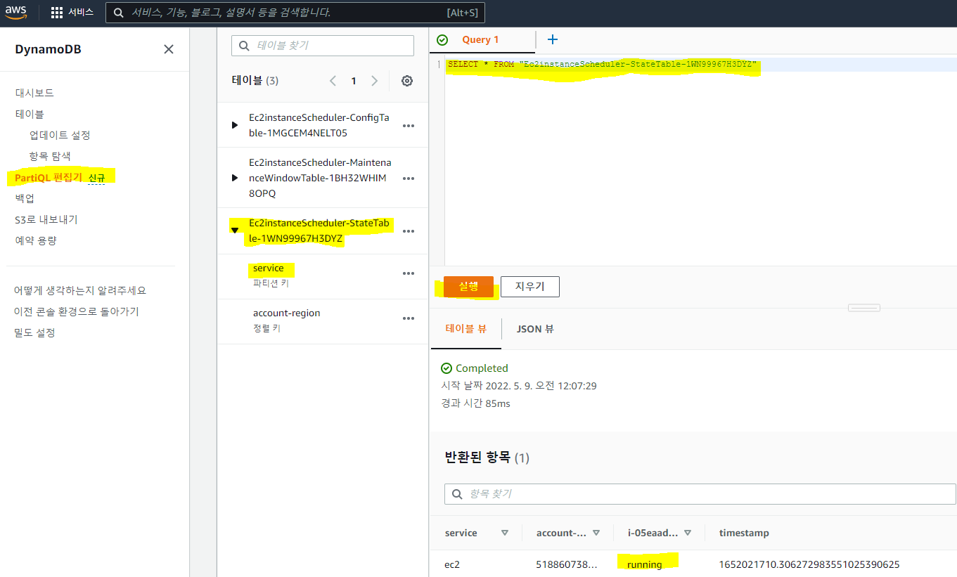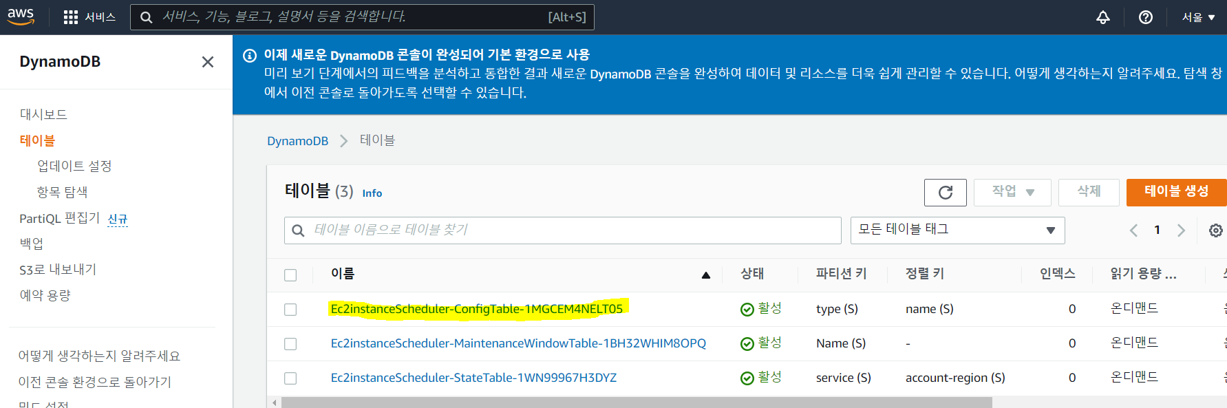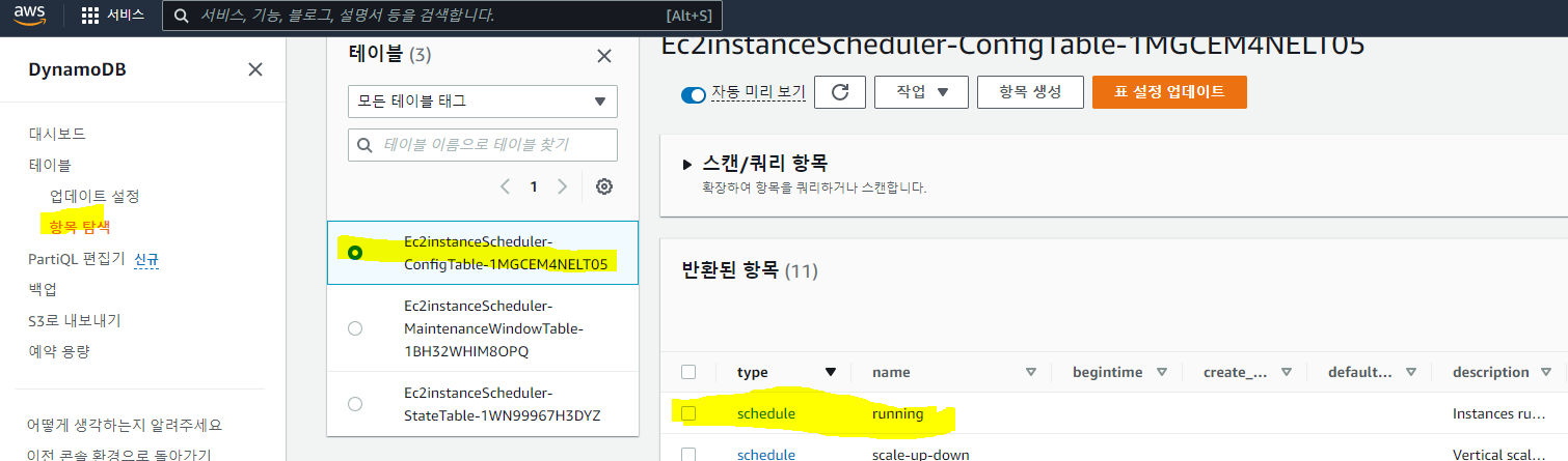 방금 만든 Ec2instanceScheduler에서 '리소스'탭에 보면 DynamoDB를 생성한 것을 확인할 수 있다. 링크도 있음.