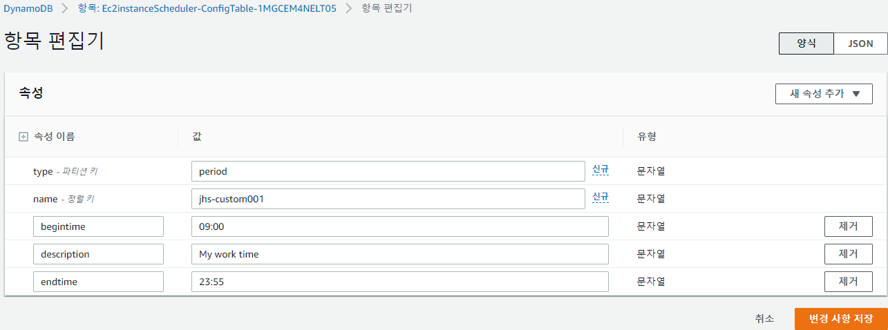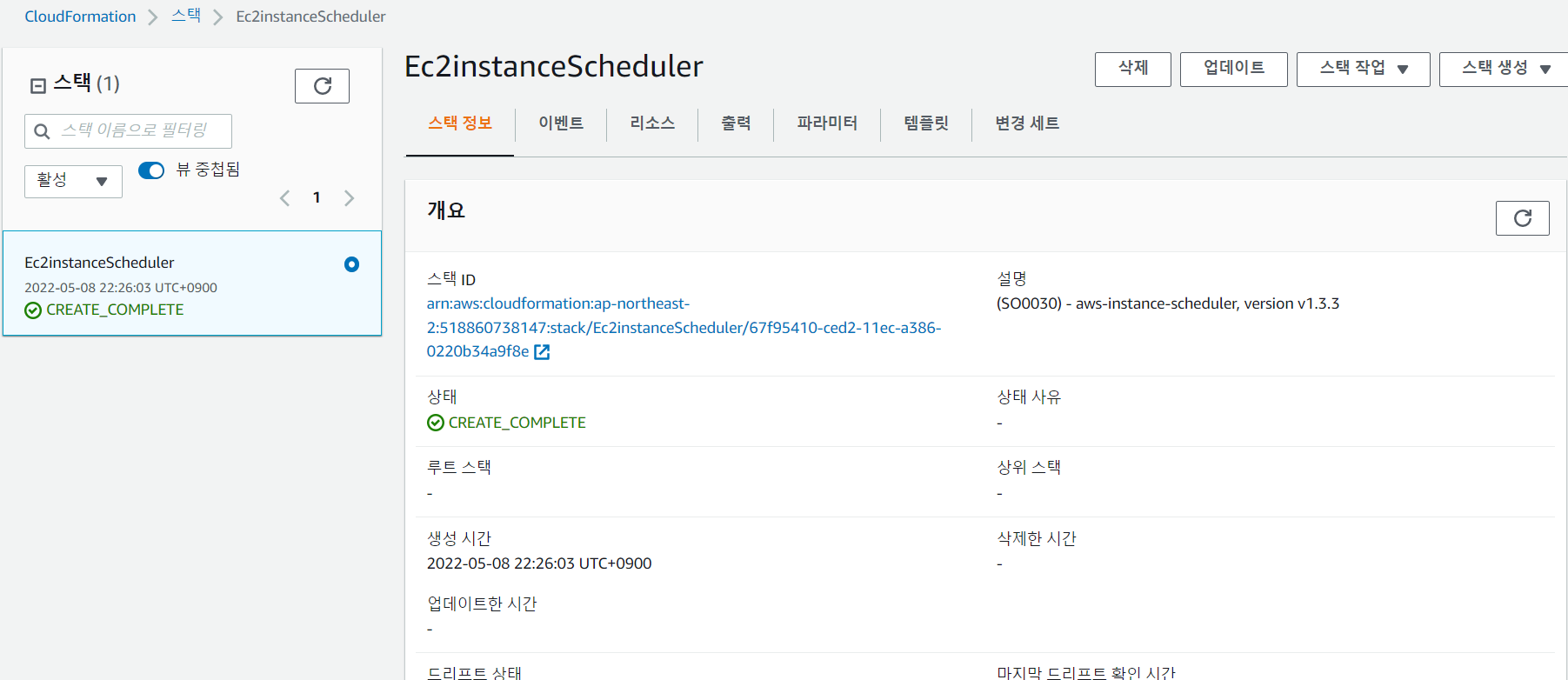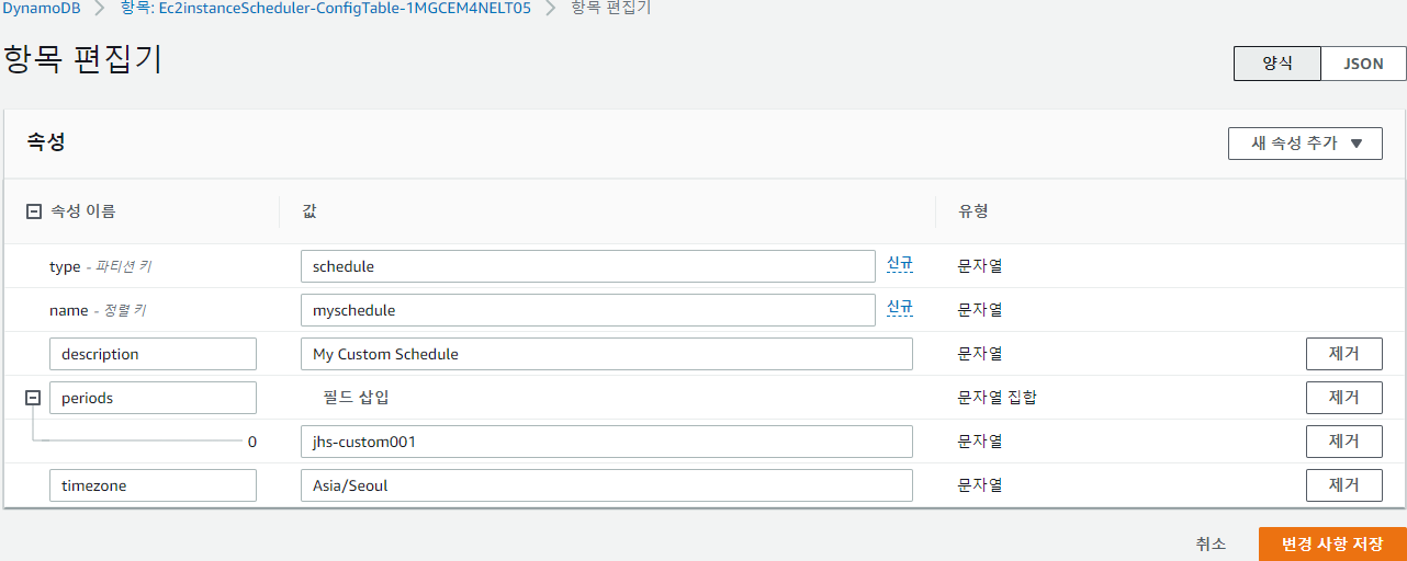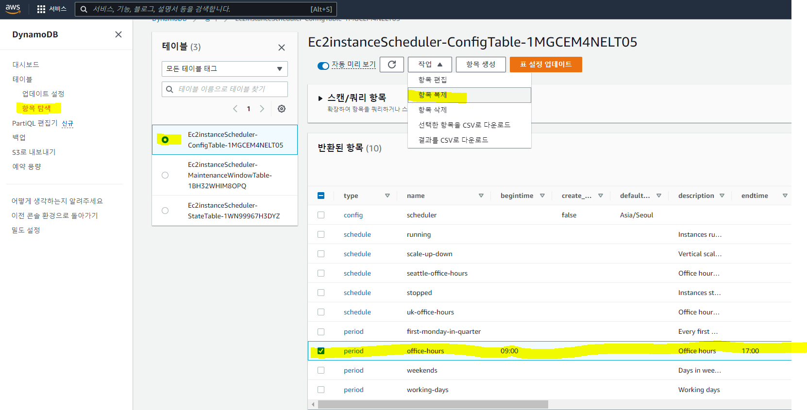 방금 만든 Ec2instanceScheduler에서 '리소스'탭에 보면 DynamoDB를 생성한 것을 확인할 수 있다. 링크도 있음.