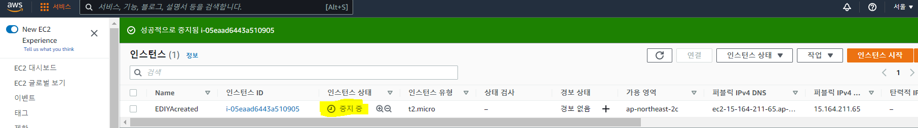 (만약 탄력적IP를 사용하고 있다면 알아두자! 탄력적IP는 인스턴스가 중지 중일때는 과금된다.