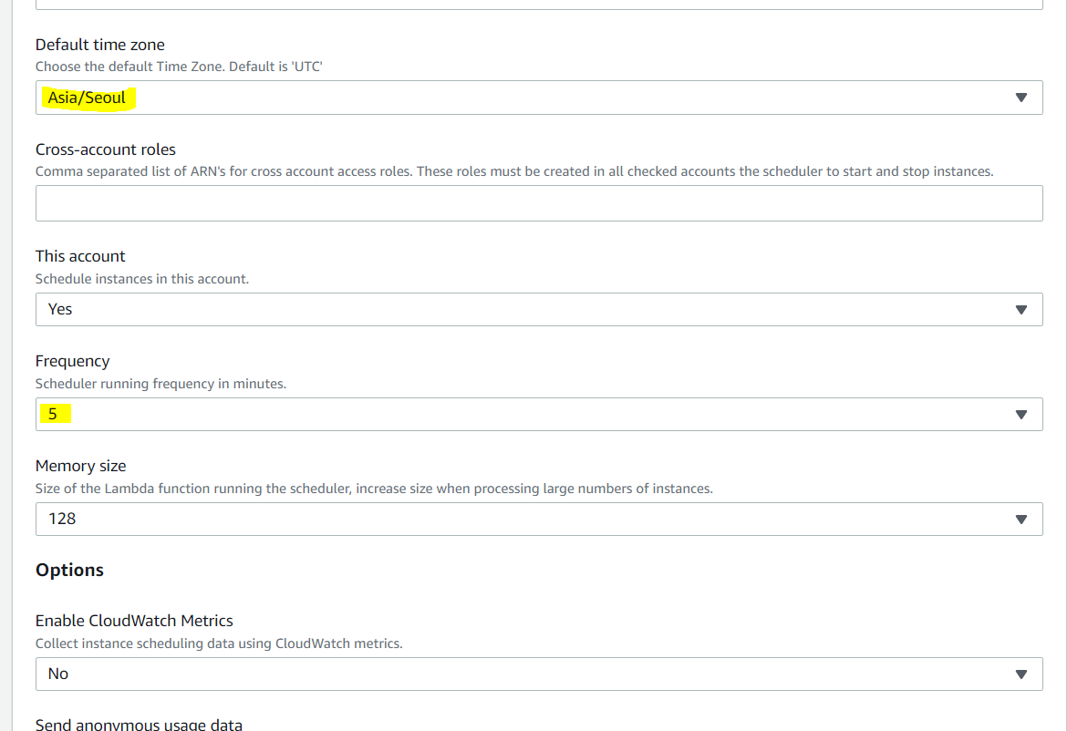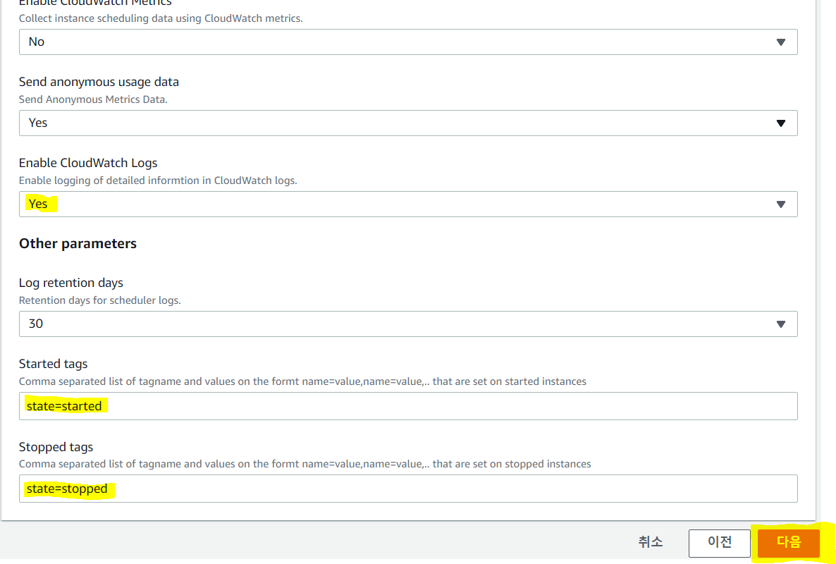 Enable CloudWatch Logs -> Yes로 설정, Started tags -> state=started, Stopped tags -> state=stopped 설정
