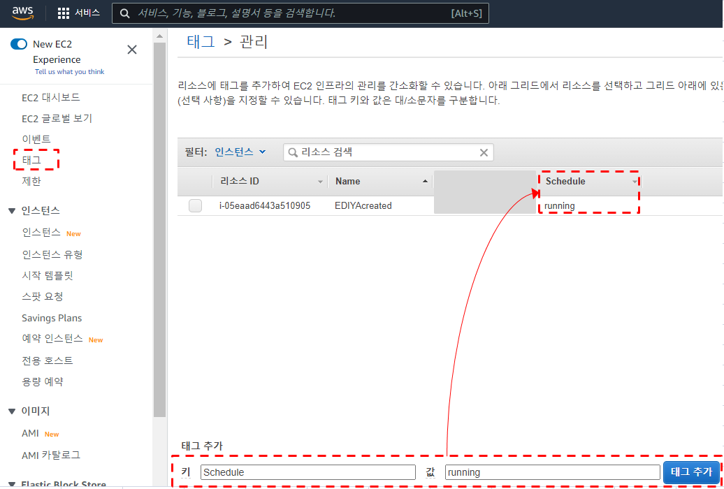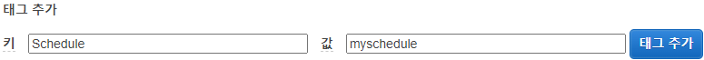 키 Schedule, 값 running 입력 후 추가 (반드시 Schedule로 대소문자 구분해서 적어주자 아래 이미지처럼 schedule 소문자로 적으면 안됨. 아까 9-2에서 설명한 tagname값임.)