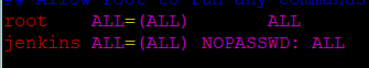 - 처음에는 'root ALL=(ALL) ALL' 만 한 줄 있는데 그 밑에 'jenkins ALL=(ALL) NOPASSWD: ALL' 이라고 적어주자