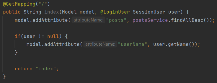 - 여기서는 postsService.findAllDesc()로 가져온 결과를 posts로 index 뷰(View)에 전달합니다.
